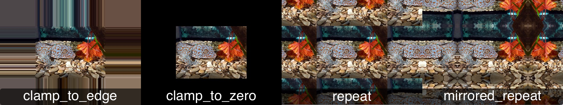coord::): You can choose between normalized or pixel coordinates, depending on what is most convenient for your task.Addressing out-of-bounds (address::): Control how texture coordinates that fall outside the valid range are handled with options such as repeat, mirrored_repeat, clamp_to_edge (default), clamp_to_zero, or clamp_to_border.
