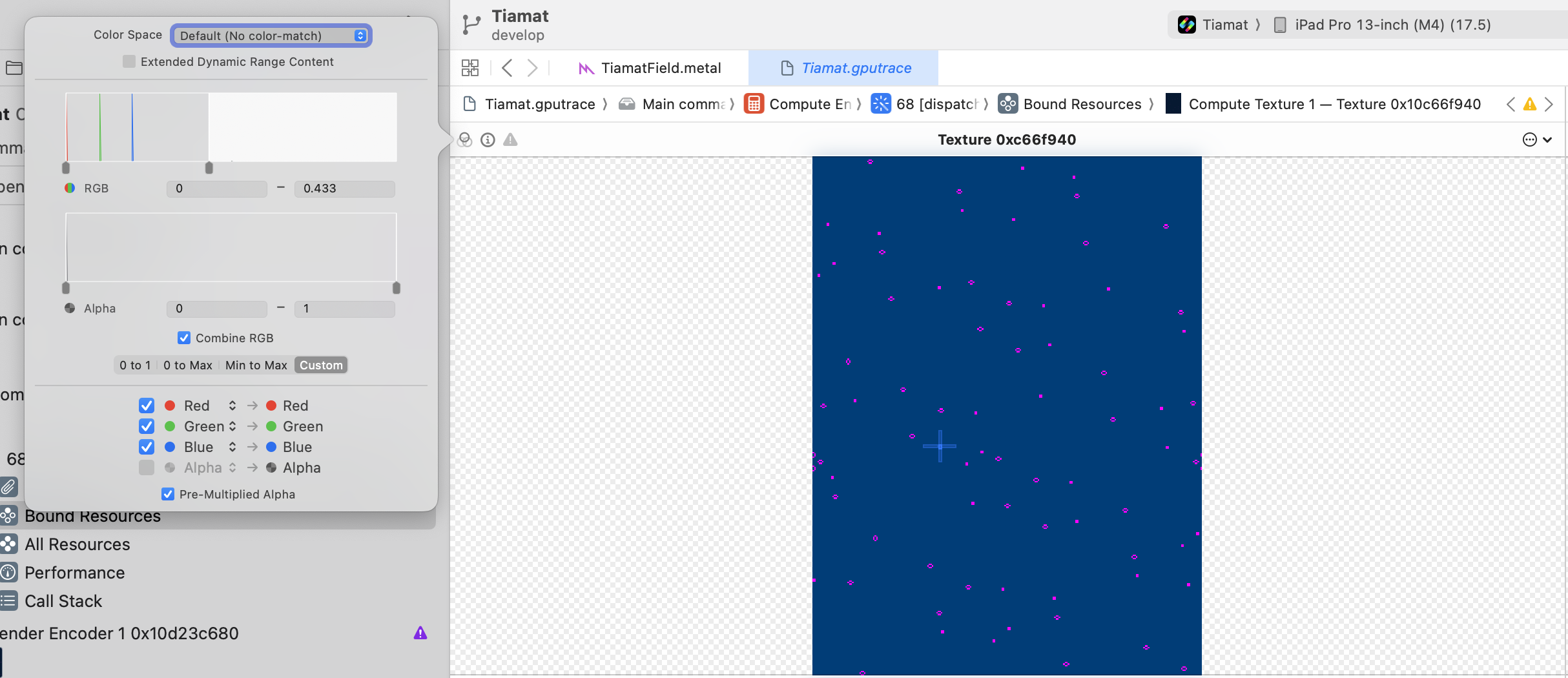 As you can see, this method doesn't require a device instance or command buffers - everything happens directly in the texture's memory. This is possible because of the shared storage mode.