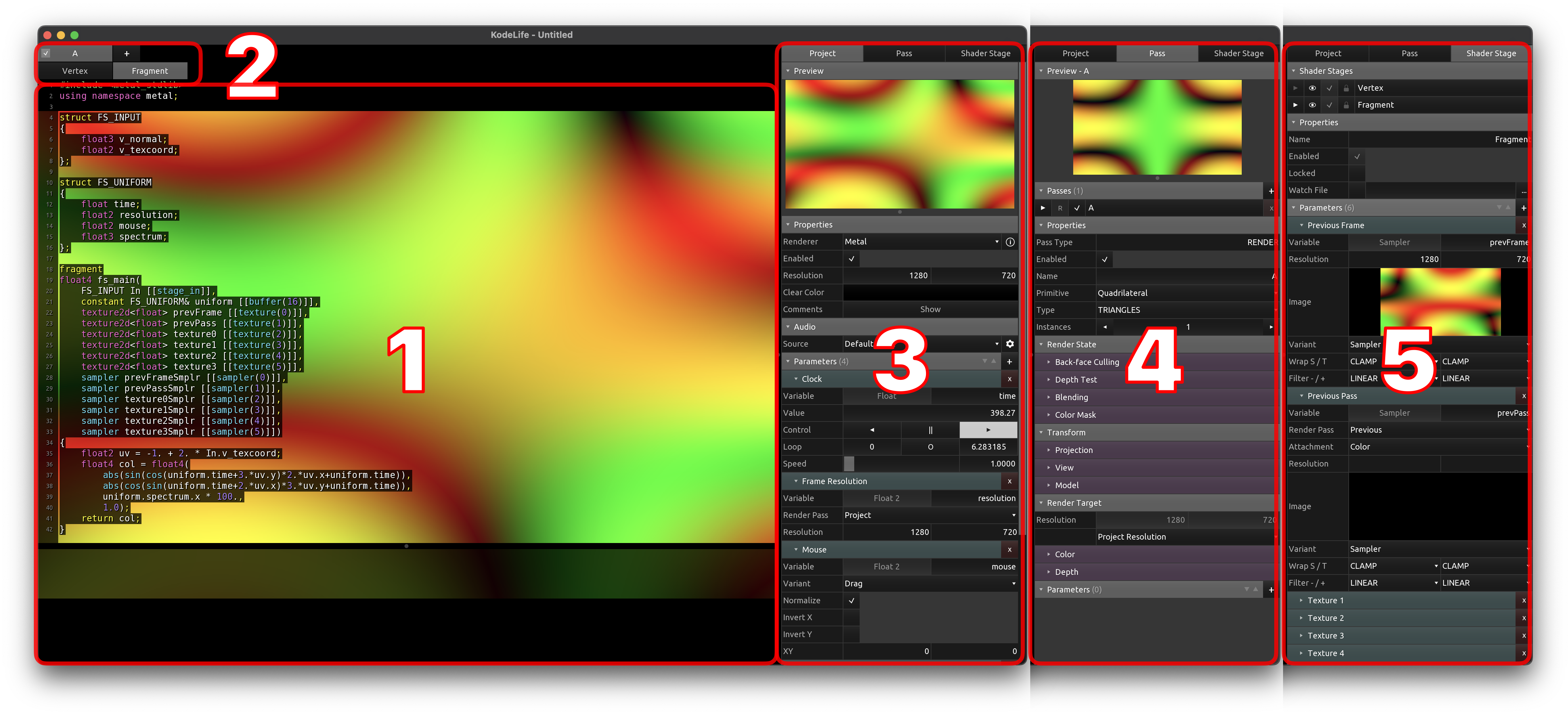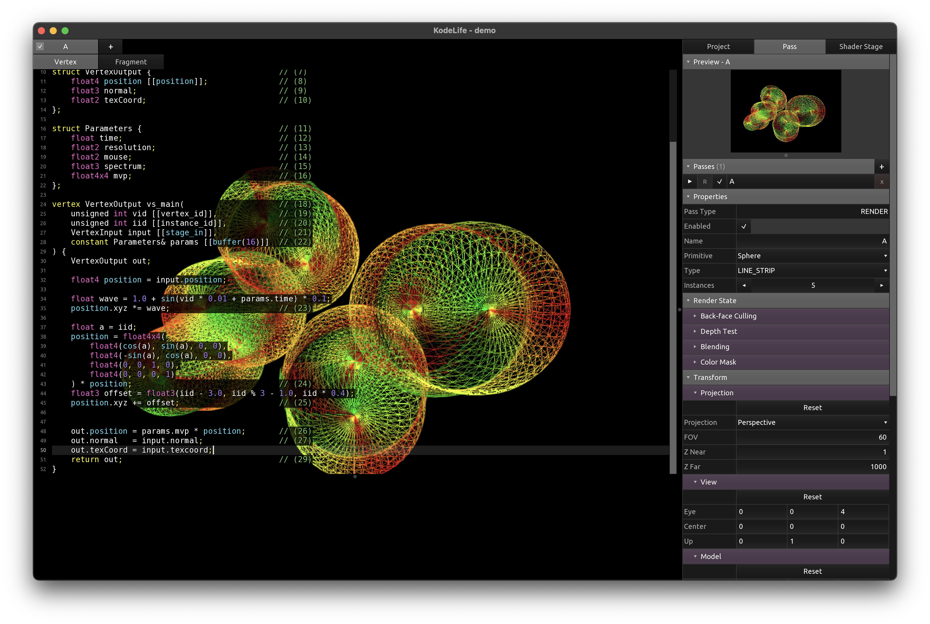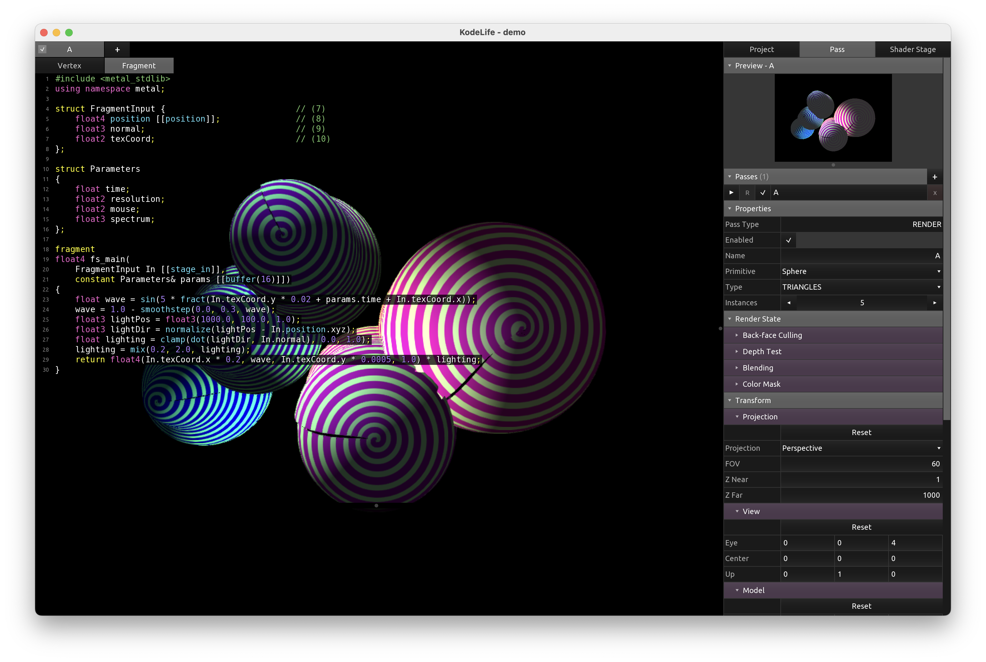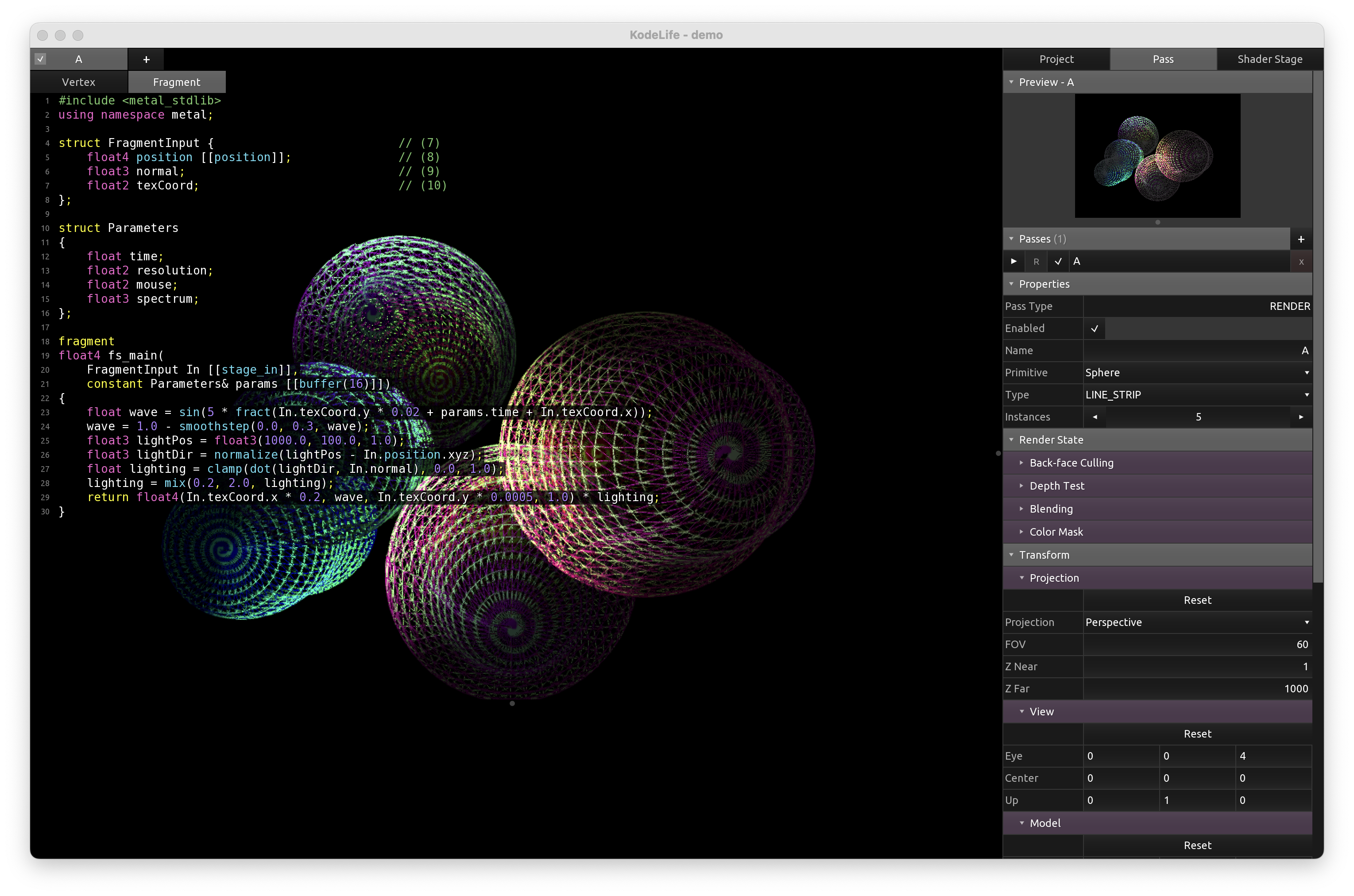 metal:: explicitly, you can skip this step.[[position]], representing the vertex’s position in the viewport. Without this, rendering won’t work, as there would be no displayable position.time, output resolution, mouse position and status, spectrum (just low, mid, high), and mvp - the Model, View, Projection matrix. This is actually Projection * View * Model, used to calculate vertices’ final positions in the viewport.vertex function. It returns VertexOutput—this same structure will serve as [[stage_in]] for the fragment shader, with interpolated values. The function name can vary, but KodeLife uses vs_main.VertexInput attributes from the corresponding buffers. For more details, refer to the previous episode.#include <metal_stdlib>