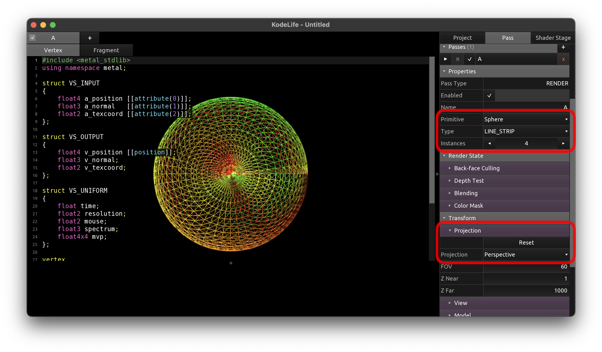 Renderer section (3), set it to Metal, and you should see something like the screen above (1).primitive to Sphere, the type to LINE_STRIP, and the instance count to, say, 5.Projection to Perspective.