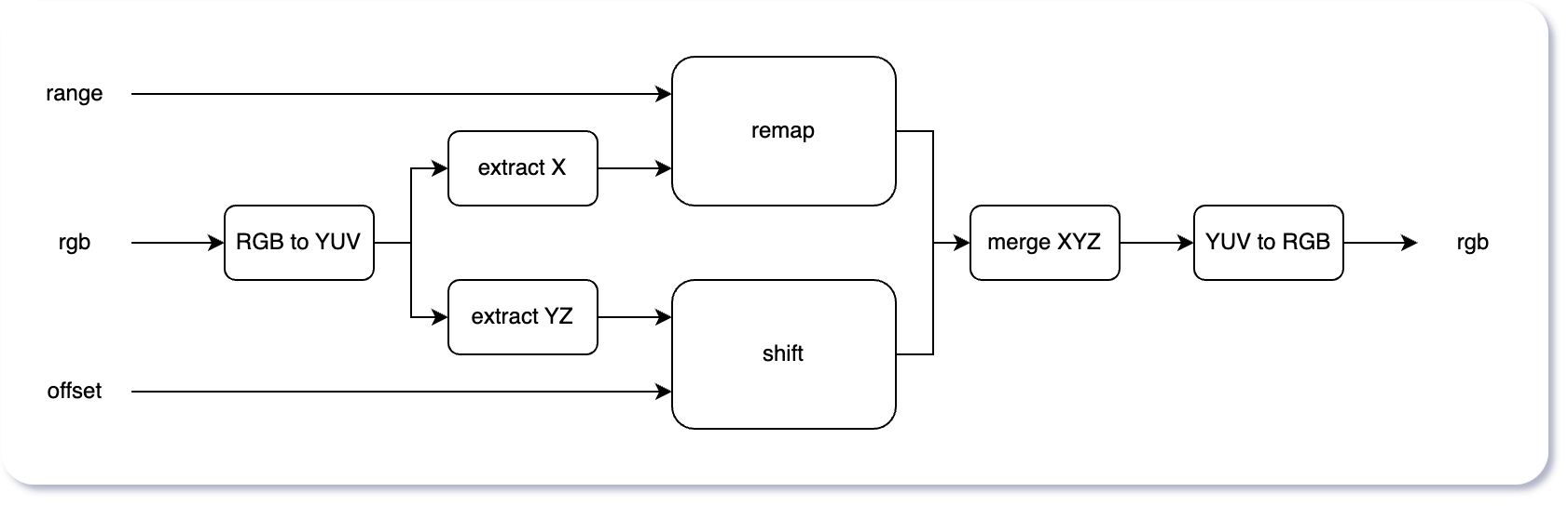nodes: [rgb2yuvFunc, extractXFunc, extractYZFunc, remapFunc, shiftFunc, mergeXYZFunc],