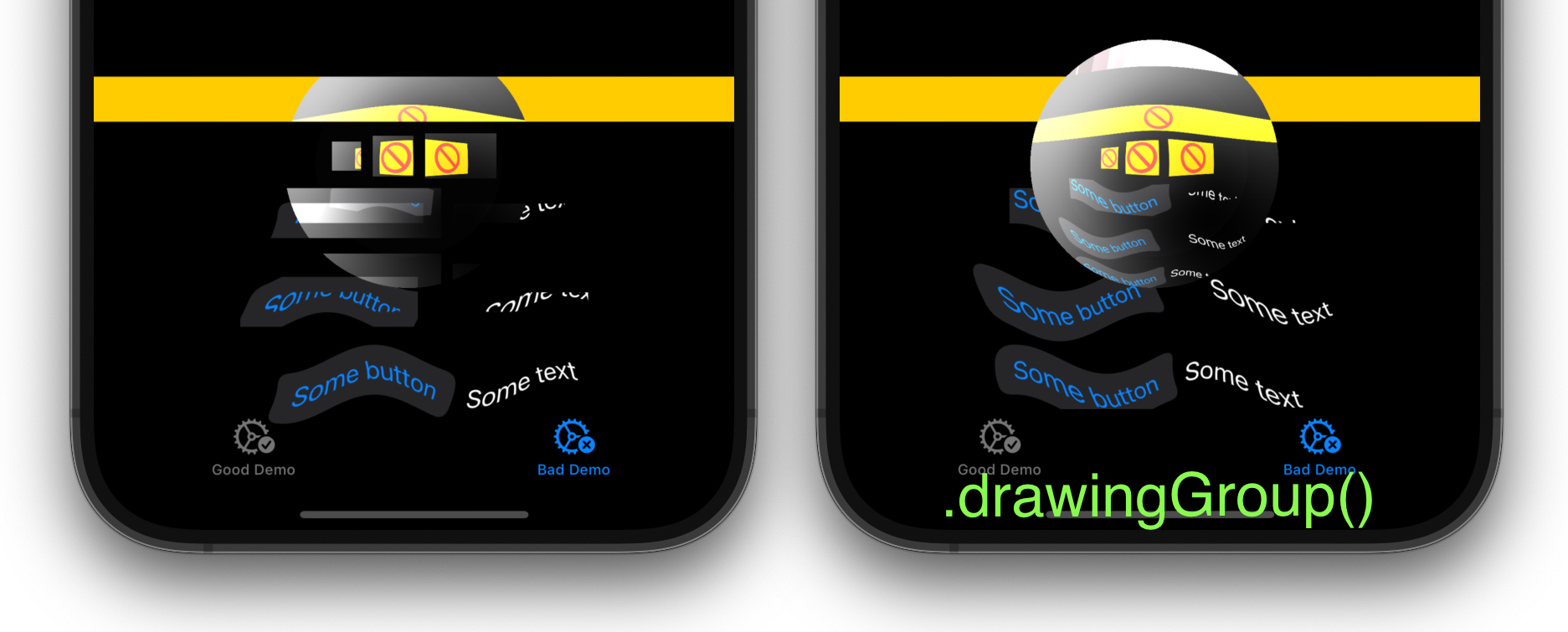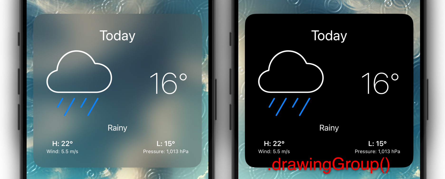 But be aware that if you apply the .drawingGroup to a view after a special background effect (for example, .ultraThinMaterial), the view will be baked separately from the whole layout and, as a result, you won’t get the beautiful blur. So bake your view before background effects (if you really need it).