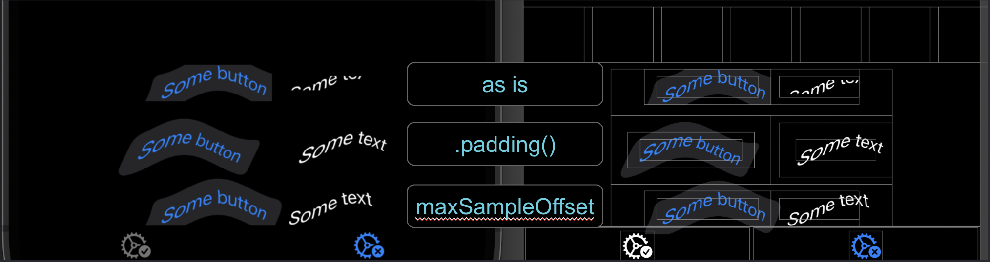 maxSampleOffsetLayer and distortion effects can extend your view’s image beyond its original bounds. Though they have a maxSampleOffset parameter that allows extending the visible area while keeping the view’s original position, the view might be cropped by its parent because the image goes beyond the parent’s borders as well. Therefore, a solution can be to apply padding before grouping instead of using maxSampleOffset (just pass .zero there):