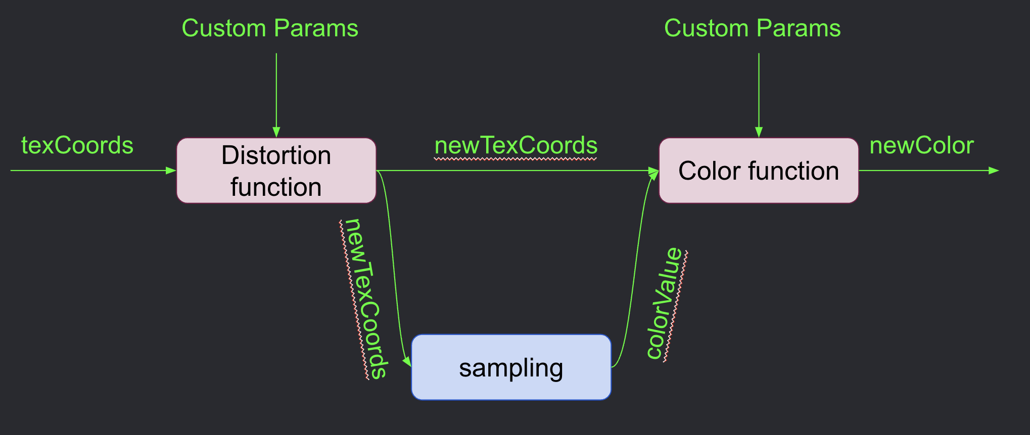 position is the pixel’s location in subhierarchy space (this value might be modified by a distortion effect — see below in the Pipeline section). This parameter is mandatory.currentColor is the pixel’s current color, also mandatory.size is our custom parameter. You can introduce as many custom parameters as you need.