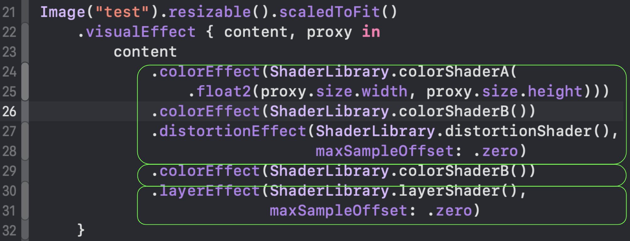 layerEffect implemented in our Metal function layerShader. This time it doesn’t have any custom parameters.#include <SwiftUI/SwiftUI_Metal.h>