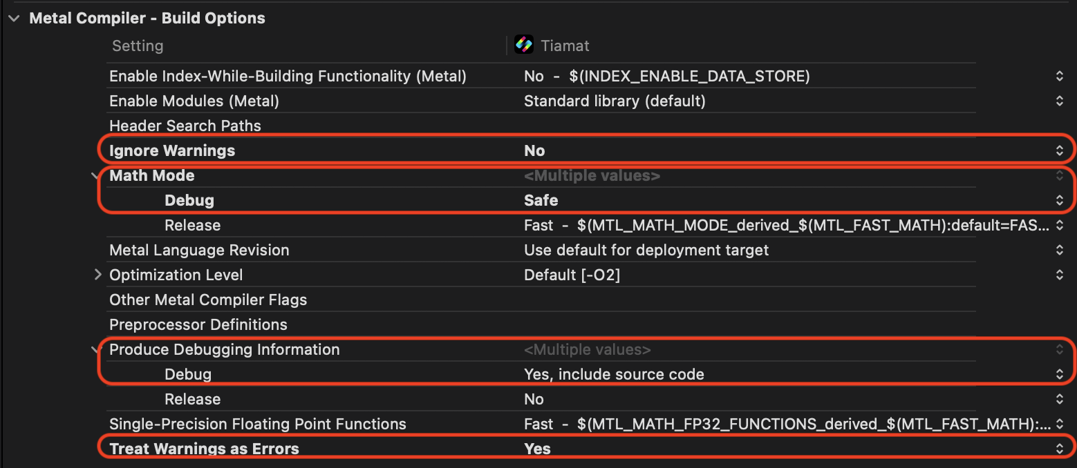 Produce Debugging Information to Yes, include source code for Debug (it should be by default) - we'll need that in further episodes, but just check.Math Mode to Safe. It turns off aggressive assumptions and approximations and forces precise math. Use it for computations that require high precision.Ignore Warnings to No. Never ignore warnings - they often point to real problems.Treat Warnings as Errors to Yes. It can be annoying, but it keeps your code much cleaner and more stable.