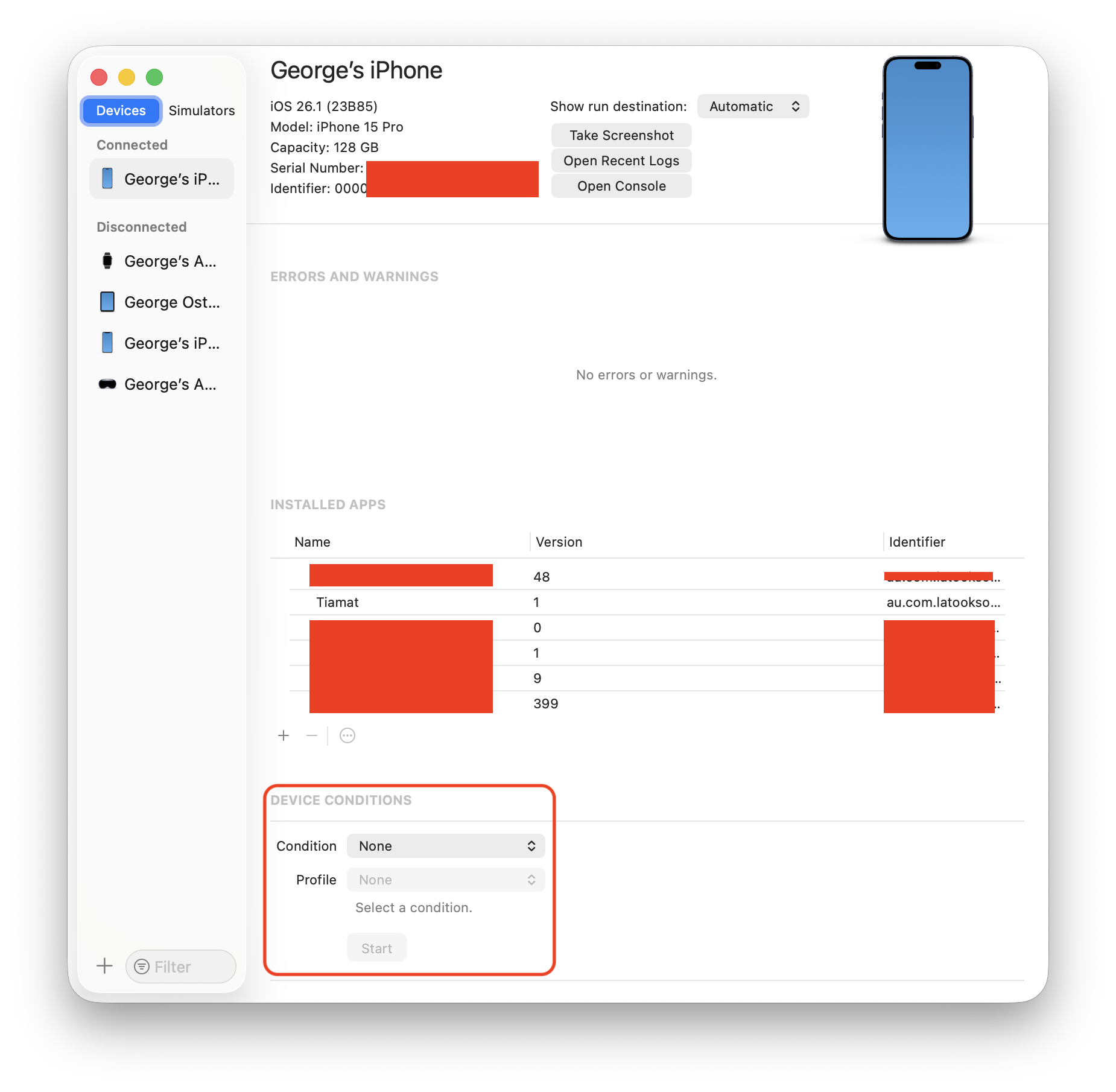 There you can see a list of your devices, their information, logs, console, installed apps, and conditions. We're interested in the last one, but logs and the console might be helpful too.