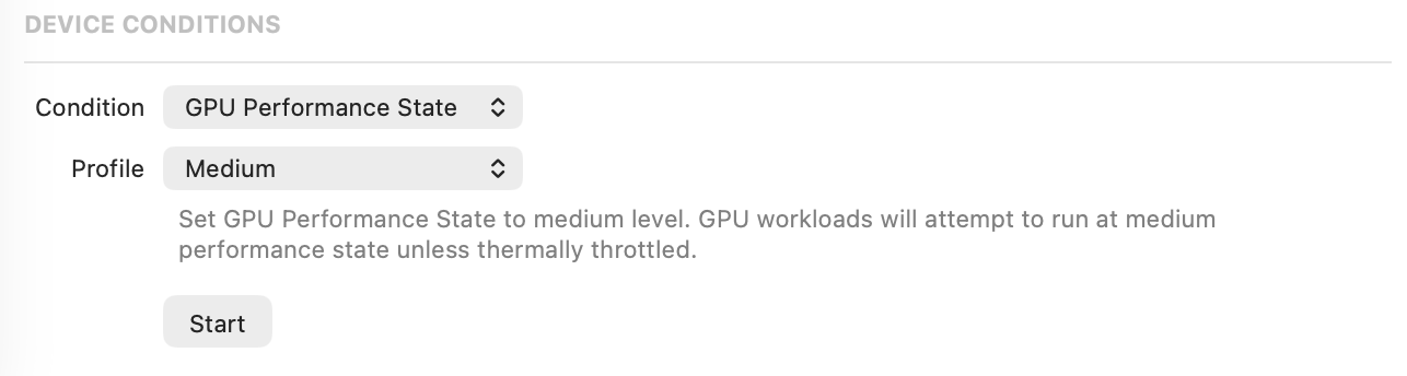 This one emulates different conditions for the GPU, which the OS normally sets depending on thermal state, utilization, system settings, etc. When you set the state, the OS tries to keep it while it's possible and safe.